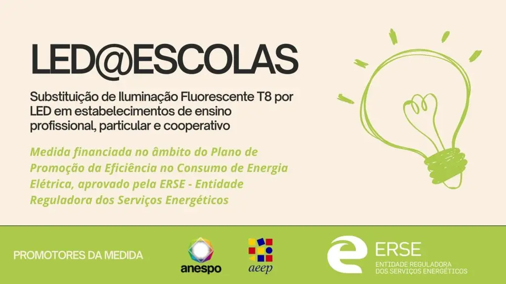 Promovido pela ANESPO, em parceria com a AEEP, o LED@Escolas substitui a iluminação fluorescente T8 por LED em escolas profissionais, particulares e cooperativas, envolvendo a comunidade escolar na criação da imagem corporativa do projeto